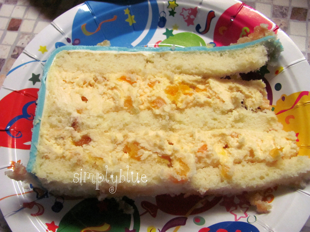 vanilla cake, apricot mousse with mascarpone and fruit pieces
